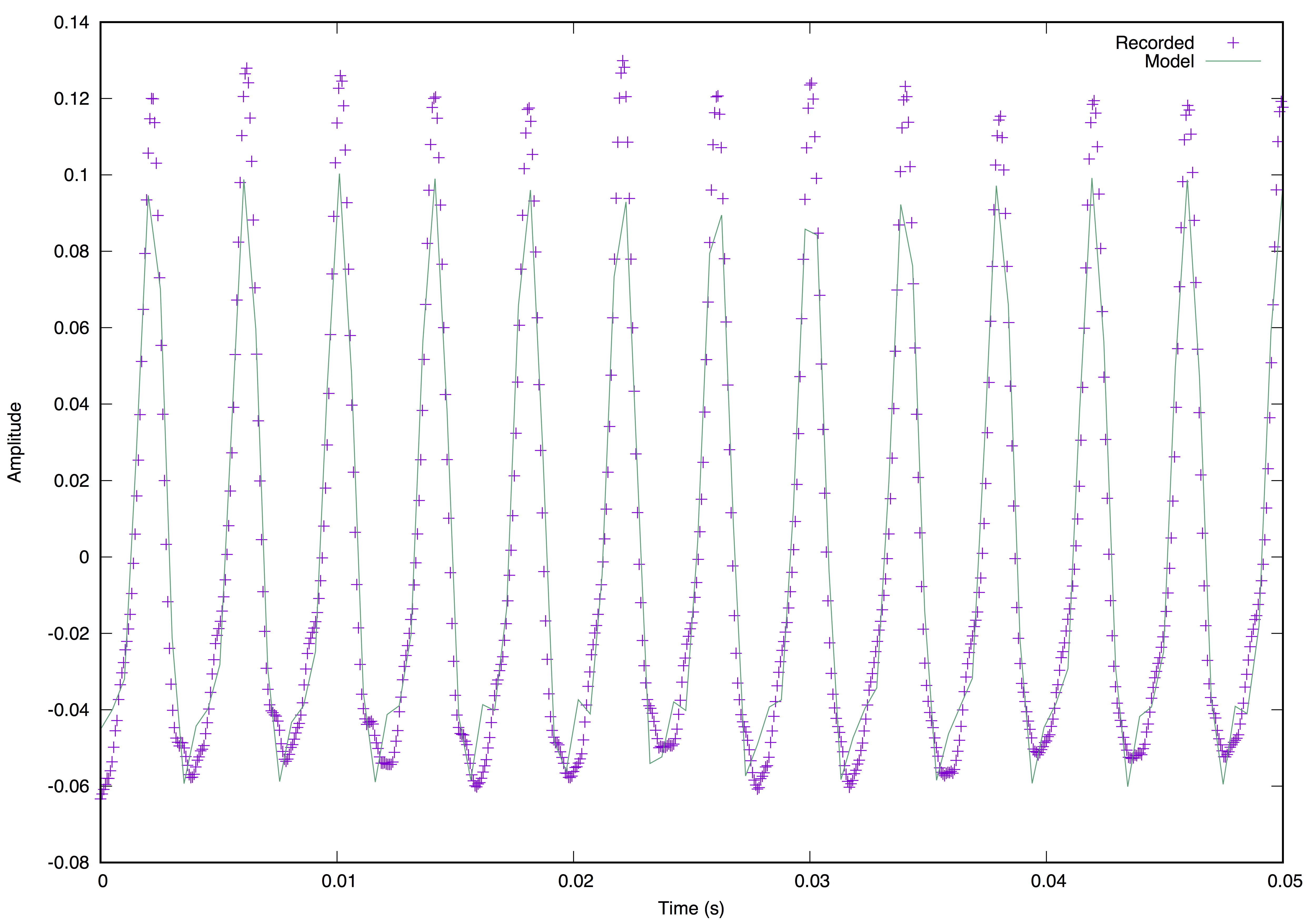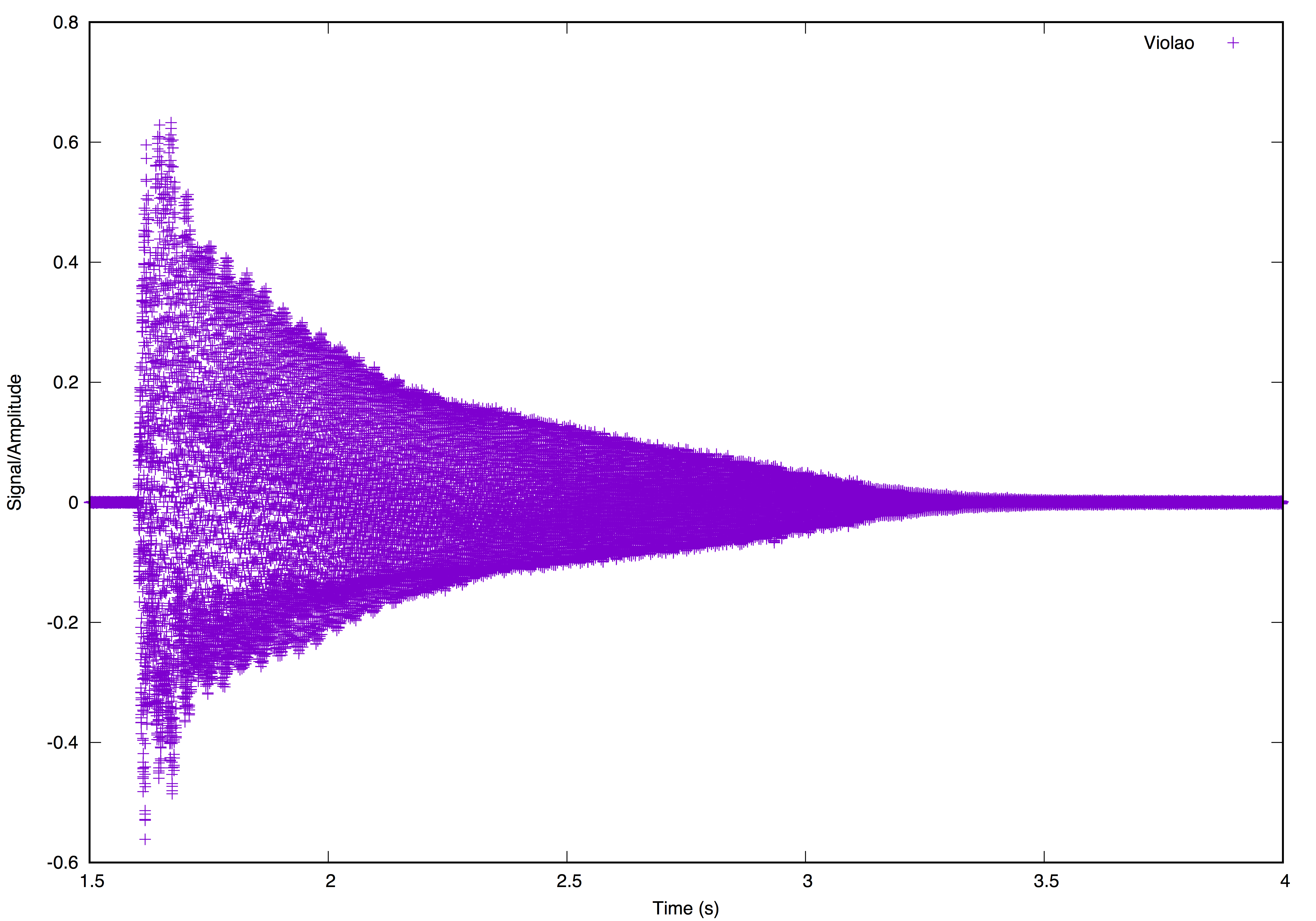 The pictures above show the sound data plotted for a small range of the domain (time). If we take a look at plots for the whole length of the record, a difference becomes evident...