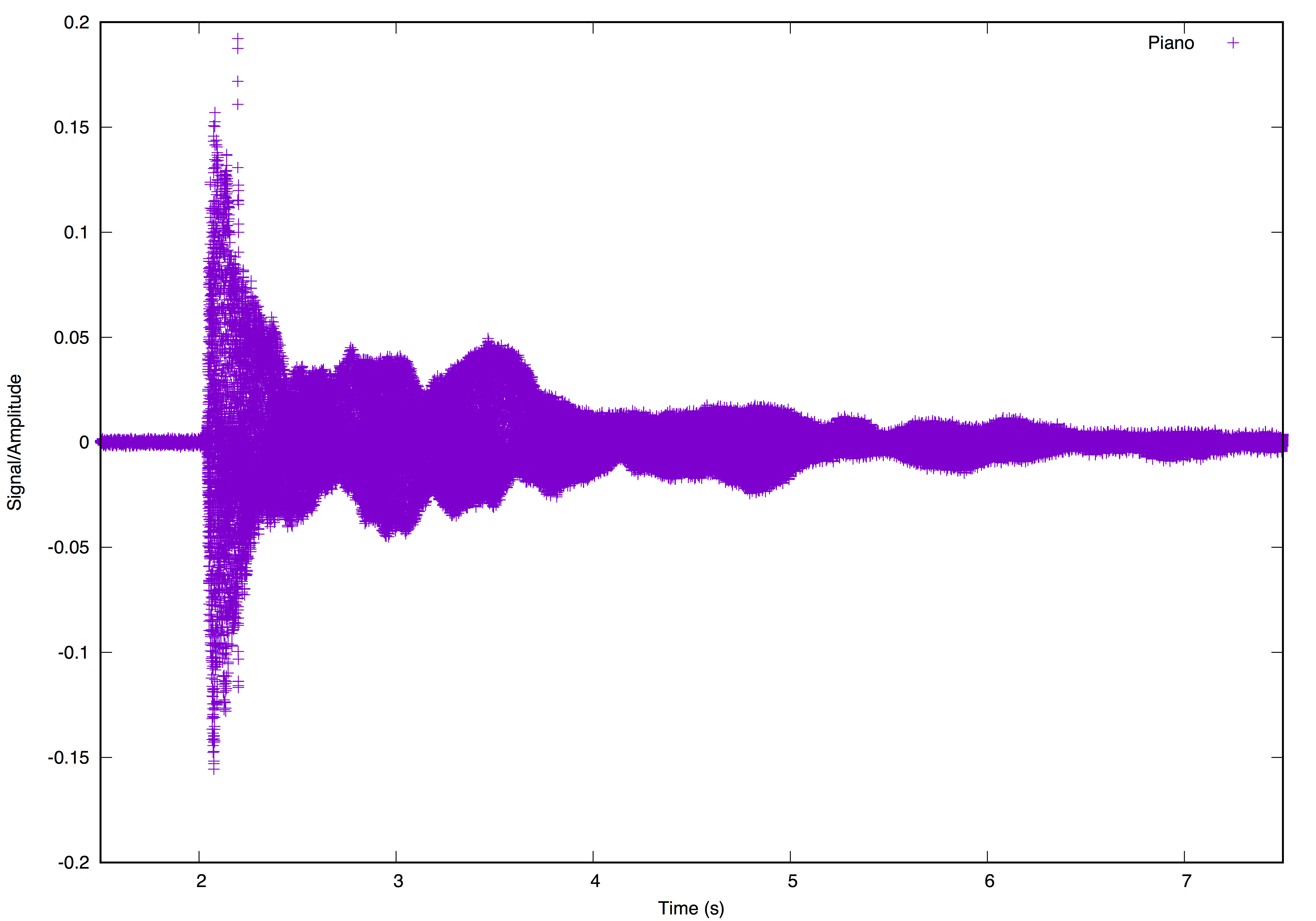For a practical reason (reducing the processing time) we took a sample from each audio file (one from the piano, one from the guitar), some one or two seconds after the corresponding string started to vibrate and applied a discrete Fourier Transform (DFT), with a program written in C, to each of them. We then plotted both "frequency spectra" superposed.
