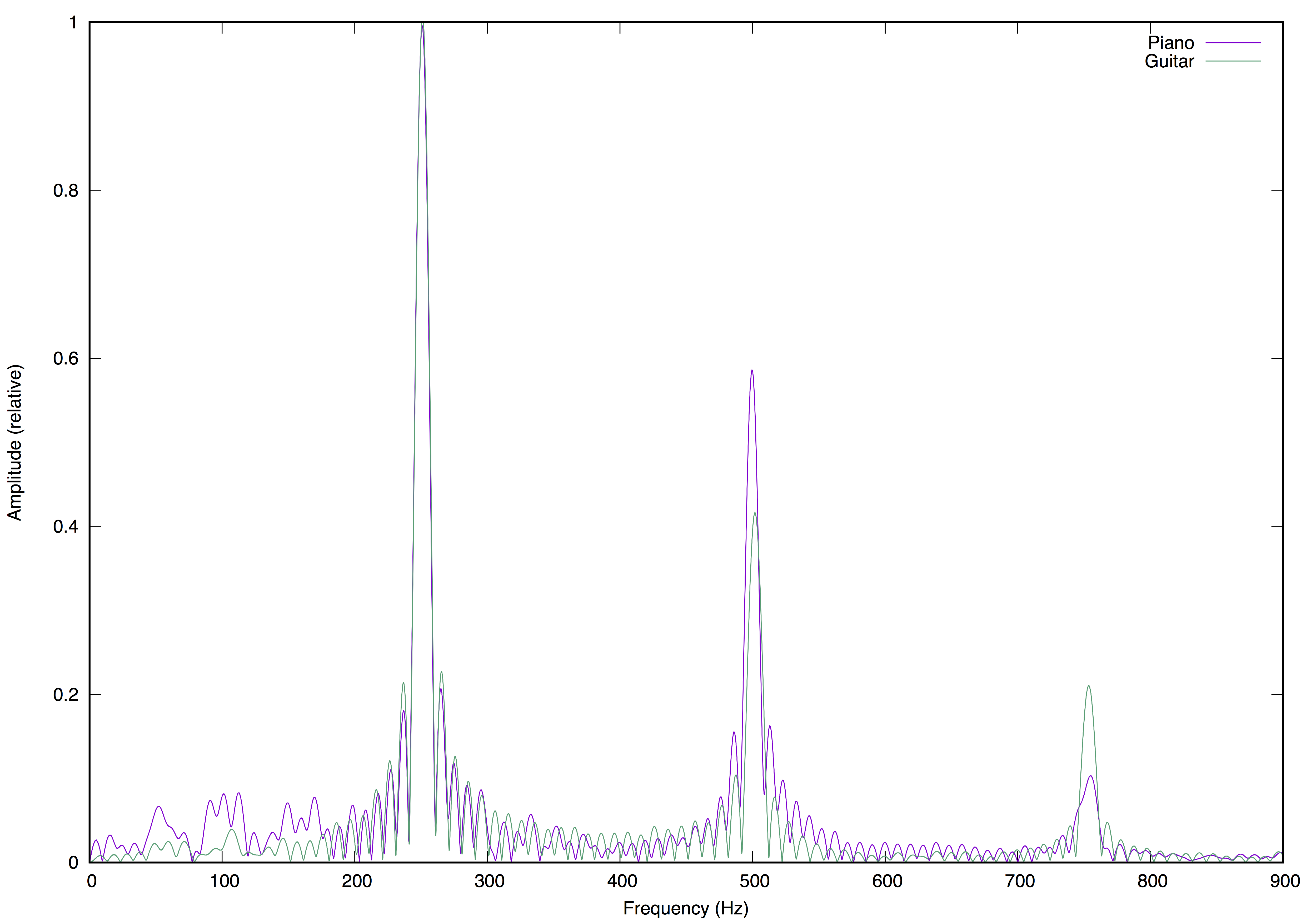 In the frequencies spectrum, we can tell one instrument from another in a more analytical way: by the relation between the amplitudes of the peaks corresponding to the fundamental frequency and each harmonic. We can see in the picture above that this relation is different for the piano and for the guitar. In fact, each instrument, while still having peaks at the same frequencies, would show its own different pattern.